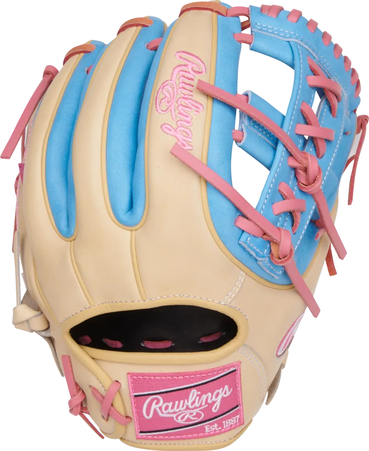Show off this stunning Rawlings 11.5-inch Heart of the Hide infield glove that features a beautiful camel and columbia blue colorway, highlighted by pink laces and welting. Not to mention the unity it has with the pink Rawlings patch!